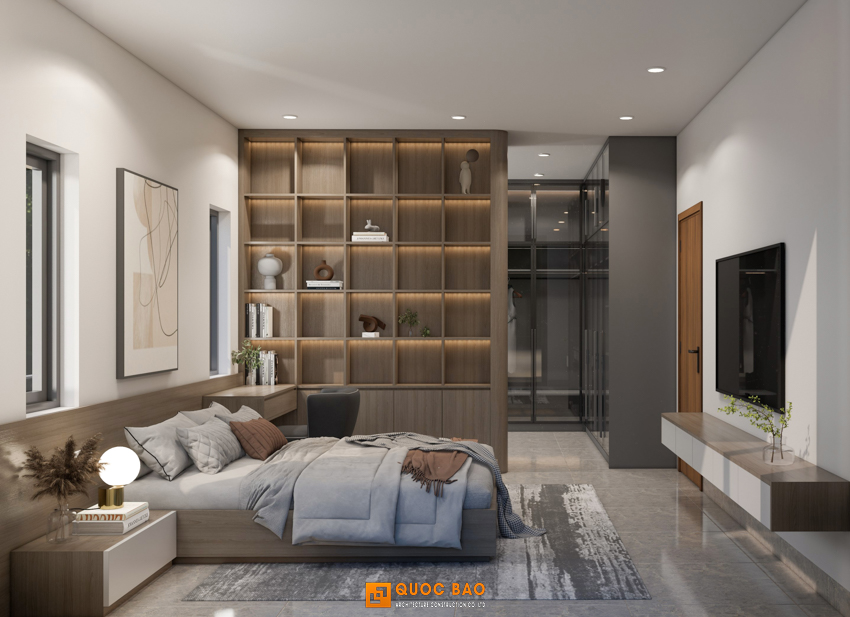 Điểm độc đáo nhất trong thiết kế phòng ngủ này là cách chúng tôi phân chia không gian bằng một hệ kệ sách/kệ trang trí kịch trần “xuyên thấu”. Hệ kệ này đóng vai trò như một vách ngăn ước lệ thông minh, tách biệt khu vực giường ngủ và khu vực thay đồ ở phía sau mà không làm bí bách tầm nhìn. Những ô kệ được tích hợp đèn LED hắt sáng, biến những cuốn sách hay đồ decor trở thành những tác phẩm trưng bày nghệ thuật.