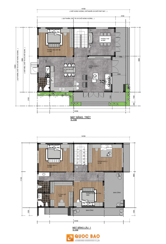 Việc loại bỏ các vách ngăn cứng nhắc giúp tăng cường sự tương tác giữa các thành viên: người nấu bếp vẫn có thể trò chuyện với người xem TV. Đặc biệt, Phòng thờ 16.5m2 được bố trí trang trọng ngay tầng trệt, hướng ra mặt tiền, thể hiện lòng thành kính của gia chủ nhưng vẫn đảm bảo sự riêng tư cần thiết. Ngoài ra, một phòng ngủ Master dành cho Ông Bà (22.5m2) với WC khép kín được đặt kín đáo phía sau, đảm bảo sự yên tĩnh tuyệt đối cho người lớn tuổi.