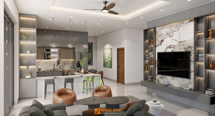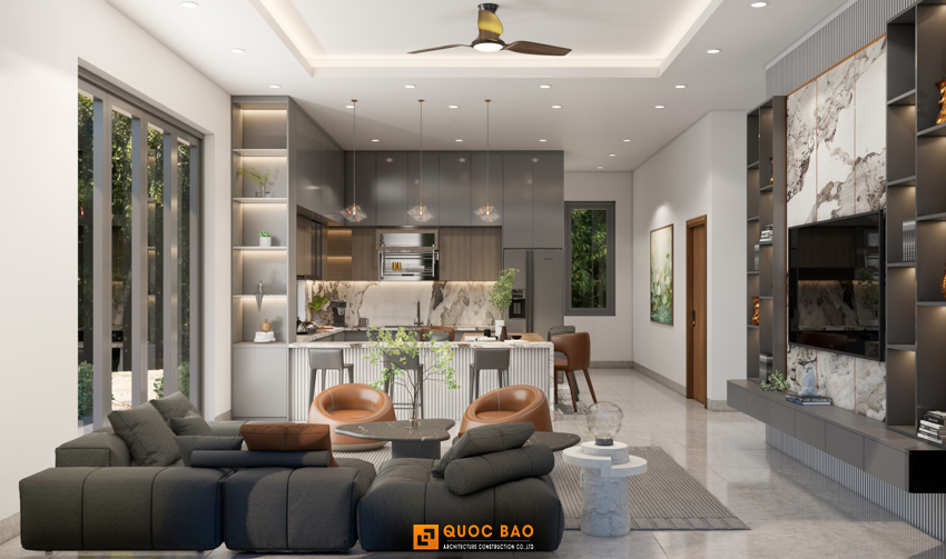 Bước qua sảnh chính, chúng ta được chào đón bởi một không gian mở liên hoàn rộng lớn. Phòng khách 30m2 được đặt tại vị trí trung tâm, đóng vai trò là trái tim của ngôi nhà. Từ đây, tầm nhìn được giải phóng hoàn toàn sang khu vực Bếp và Phòng ăn (20m2). Khu vực được nối liền, giúp các thành viên trong gia đình có thể nói chuyện với nhau khi đang ở 2 khu vực.