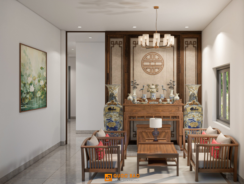 Phòng thờ là không gian tâm linh quan trọng nhất, được chúng tôi bố trí ở vị trí “tọa cát hướng cát” tại tầng trệt, nhìn ra mặt tiền thoáng đãng. Khác với sự hiện đại của các phòng khác, phòng thờ sử dụng chất liệu gỗ tự nhiên làm chủ đạo để tạo sự ấm cúng và tôn nghiêm. Hệ vách ốp sau ban thờ được chạm khắc hoa văn CNC hình hoa sen cách điệu, mang ý nghĩa thanh tịnh và bình an.