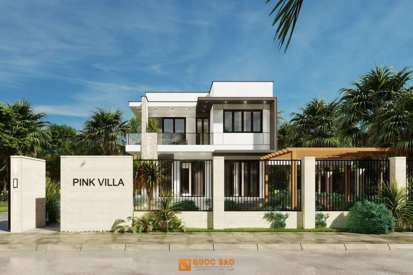 Ấn tượng thị giác bắt đầu ngay từ hệ thống tường rào kiên cố nhưng đầy tính nghệ thuật. Chúng tôi thiết kế mảng tường đá nguyên khối khắc tên “PINK VILLA” tạo sự nhận diện thương hiệu riêng biệt. Thay vì xây kín mít, hệ thống hàng rào sắt hộp sơn tĩnh điện đen chạy dọc mặt tiền được sử dụng như một lớp “vách ngăn thở”, vừa đảm bảo an ninh, vừa giúp khoe khéo vẻ đẹp của khu vườn bên trong.