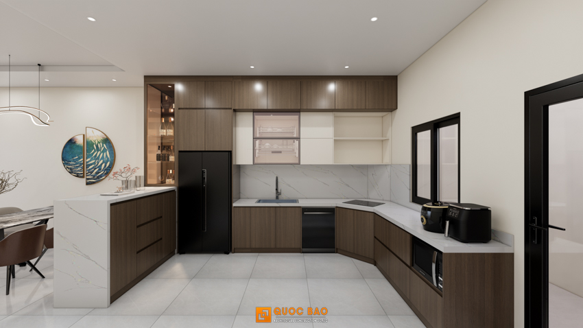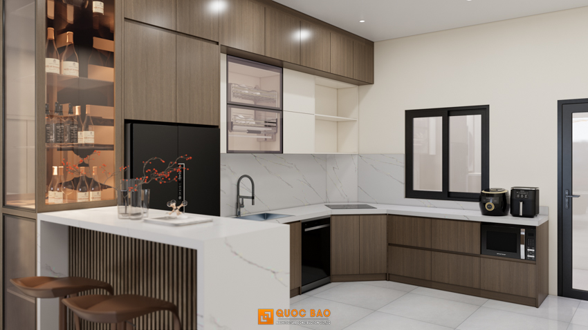 Nhưng “ngôi sao” thực sự của khu vực này chính là hệ tủ rượu kịch trần với ánh đèn vàng ấm áp, nơi trưng bày những chai vang thượng hạng khiến bất kỳ vị khách nào ghé chơi cũng phải “thèm thuồng”. Hệ tủ bếp chữ L với tông màu gỗ trầm kết hợp mặt đá trắng vân mây không chỉ đẹp mà còn vô cùng sạch sẽ, giúp các “đầu bếp gia đình” luôn có cảm hứng sáng tạo món ngon. Một quầy bar mini hiện đại nằm ngay cạnh là nơi lý tưởng để nhâm nhi một ly cocktail và tán gẫu sau ngày dài.