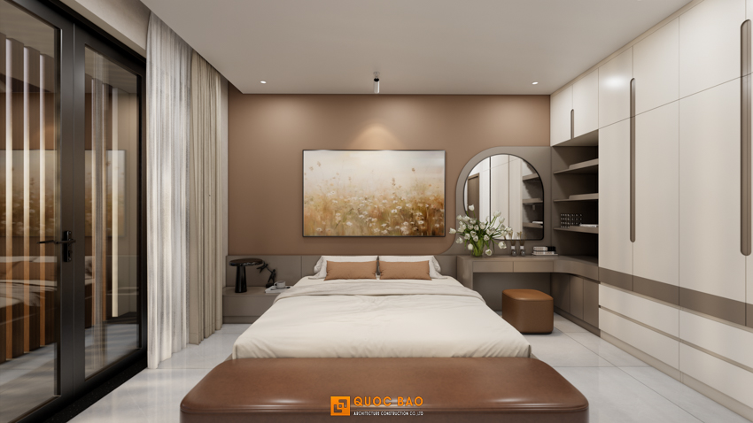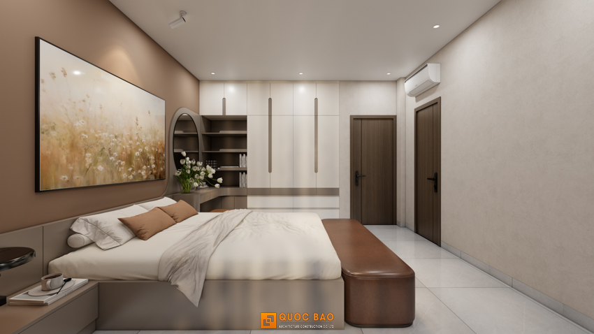 Bước vào phòng Master, bạn sẽ có cảm giác như vừa check-in vào một resort 5 sao tại Đà Lạt. Mảng tường đầu giường màu nâu đất (Terracotta) ấm áp kết hợp cùng bức tranh trừu tượng khổ lớn tạo nên một chiều sâu đầy nghệ thuật.