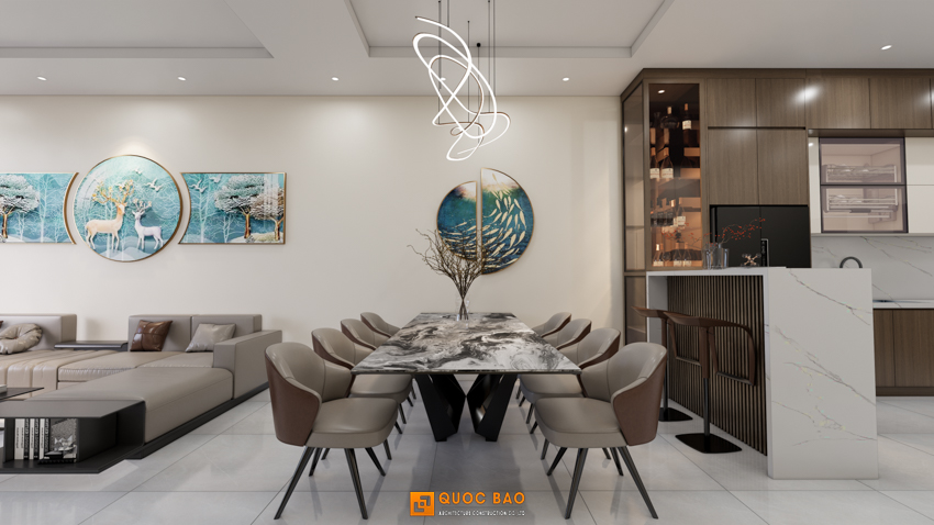 - Phòng ăn & Bếp: Kết nối trực thông với phòng khách, có quầy bar mini và tủ rượu “hoành tráng”.